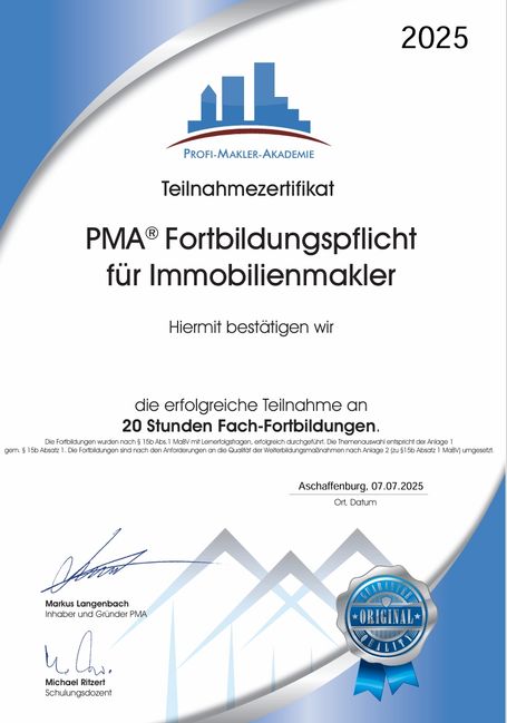 Zertifizierter, geprüfter Immobilienmakler mit Abschluss bei der Industrie und Handelskammer Wiesbaden.
